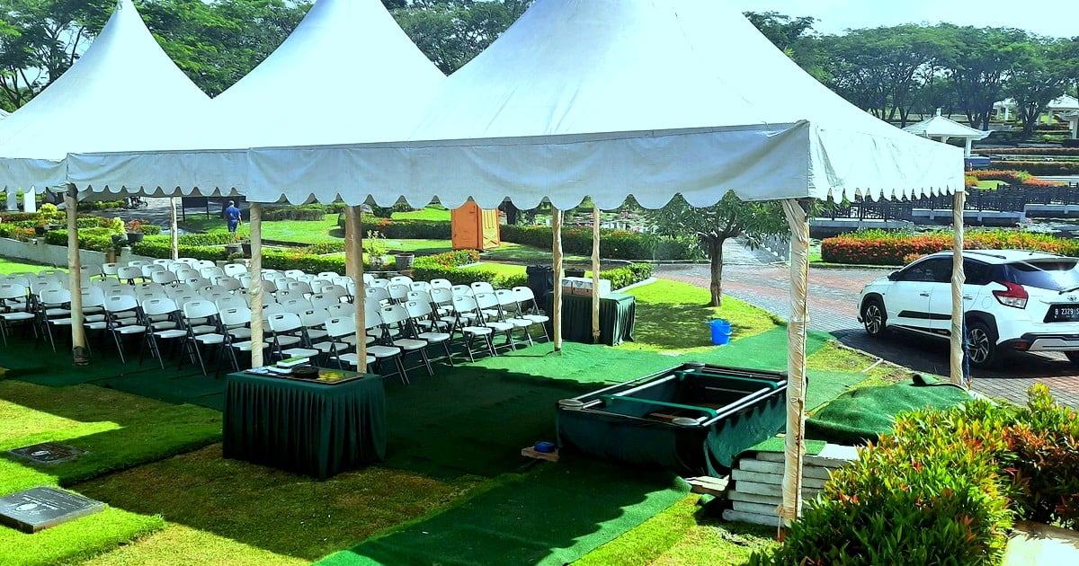 Suasana persiapan tenda ceremony pemakaman di San Diego Hills — taman hijau asri sebagai latar belakang prosesi pemakaman yang tenang